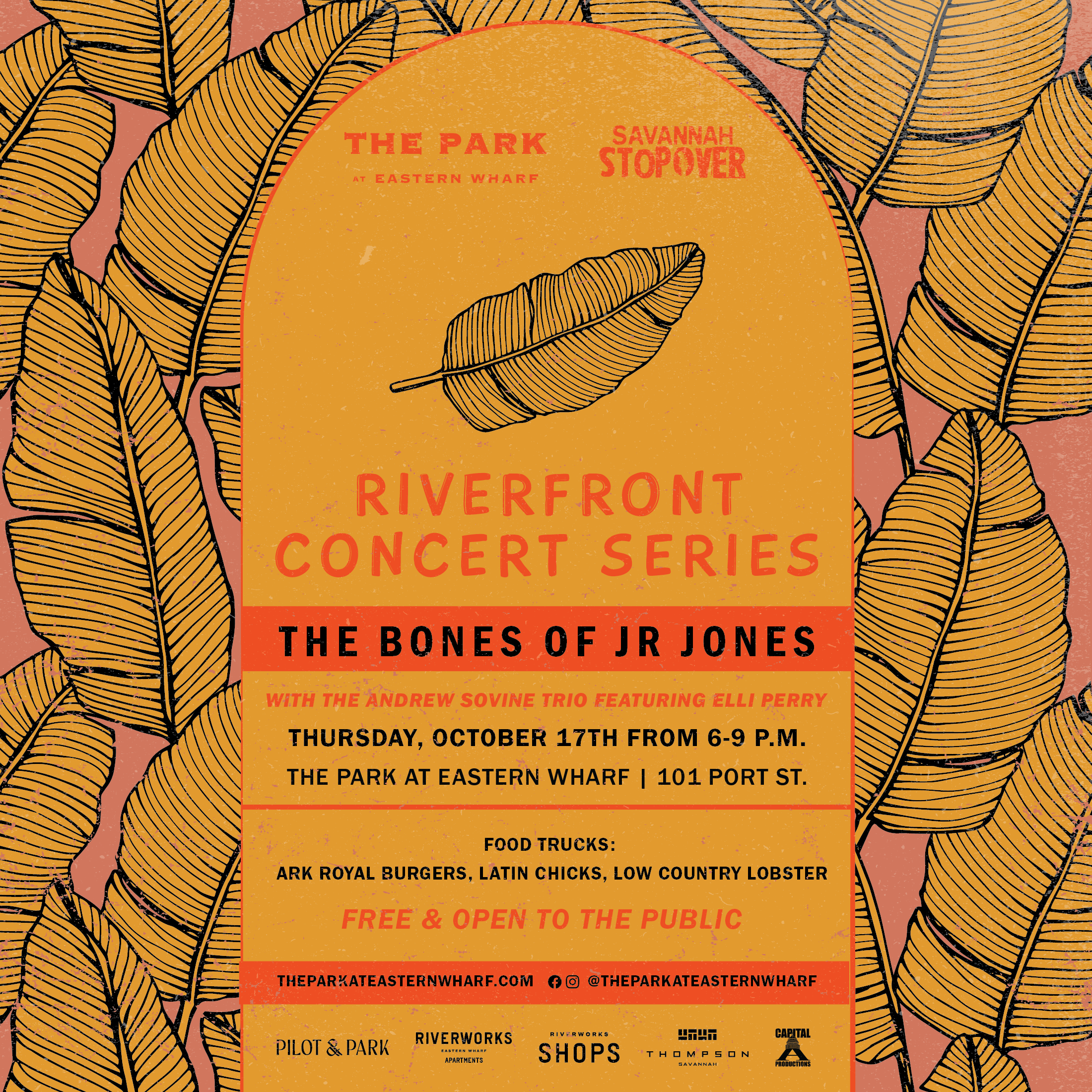 Savannah Stopover Music Festival and The Park at Eastern Wharf are teaming up for the monthly Riverfront Concert Series! The next Monthly Concert is Thursday, October 17th from 6-9 p.m. featuring Stopover alum The Bones of JR Jones and the Andrew Sovine Trio featuring Elli Perry.